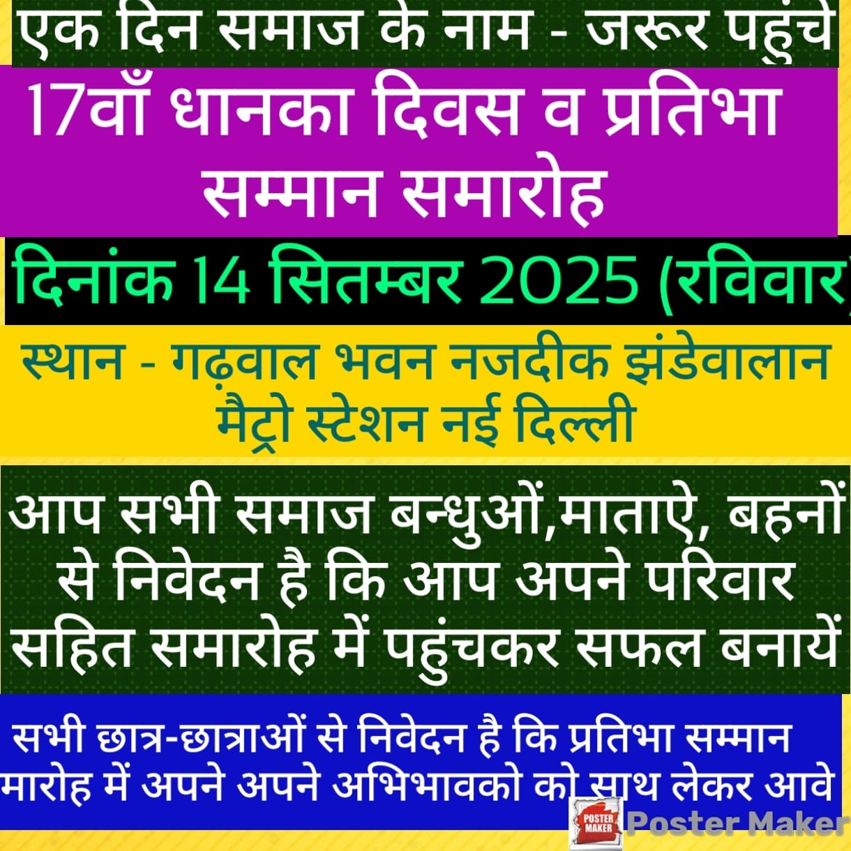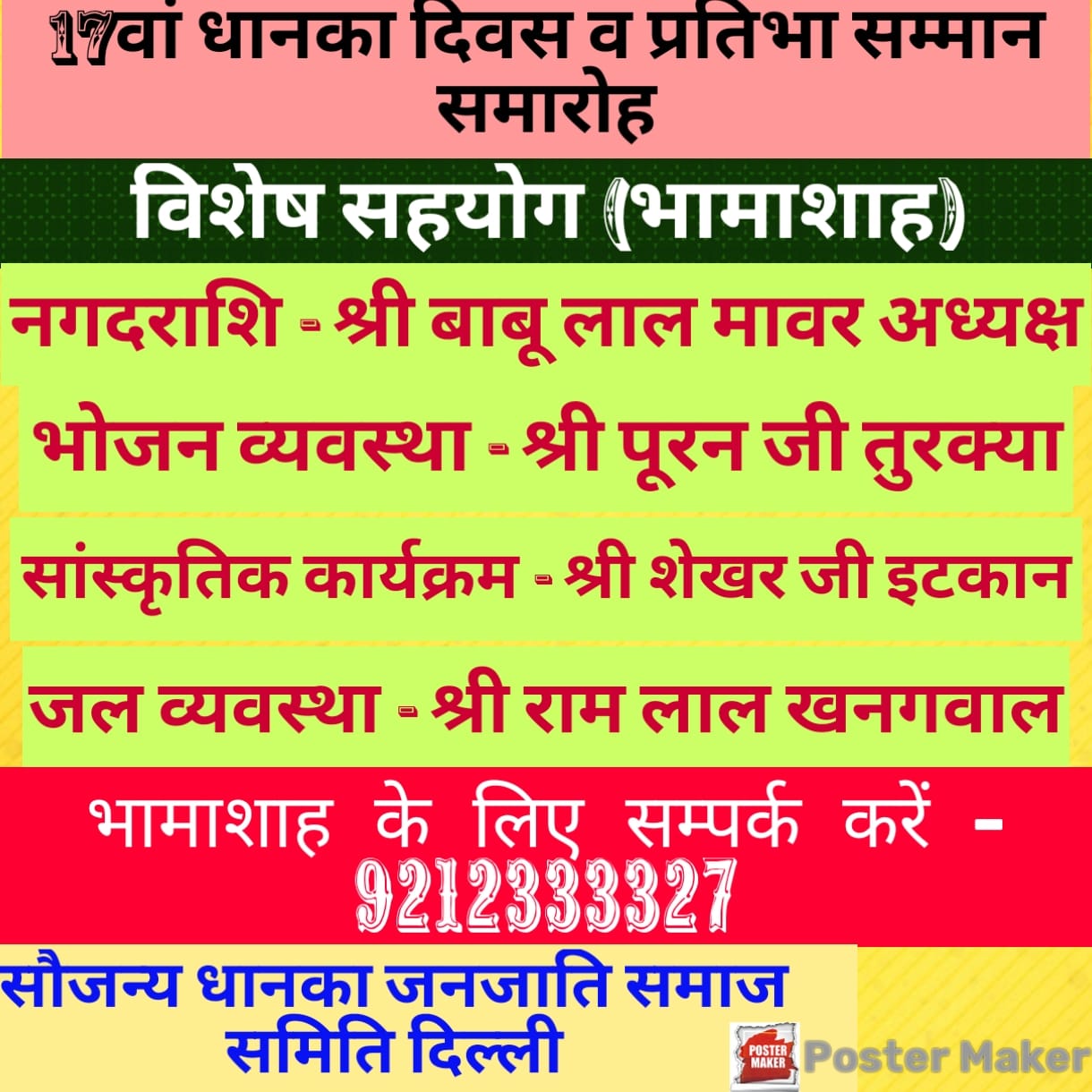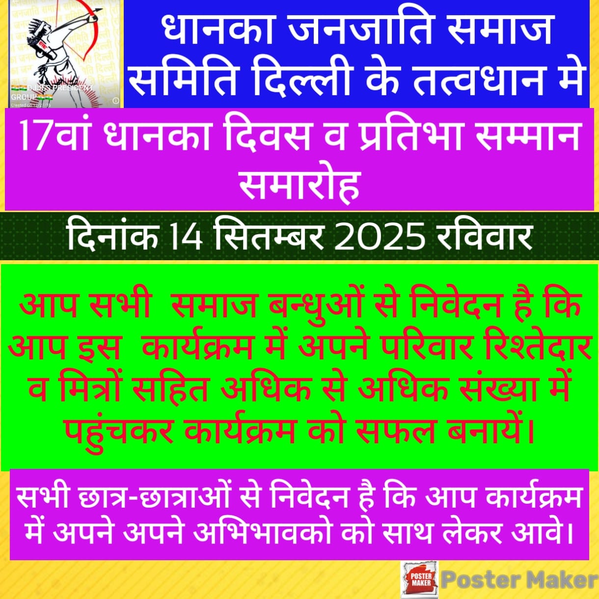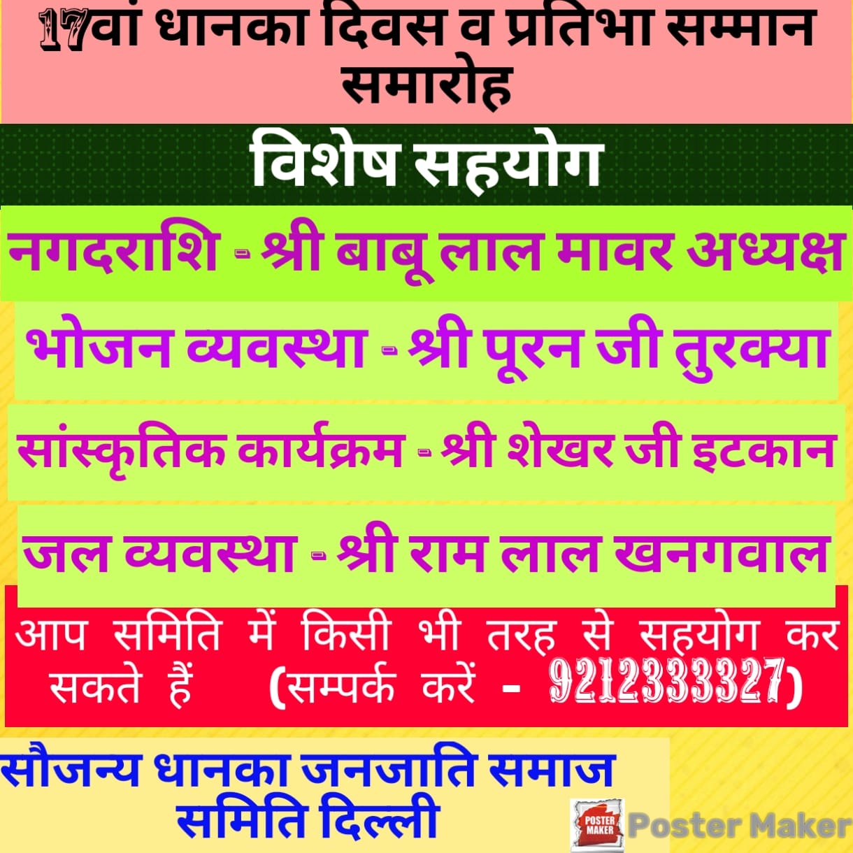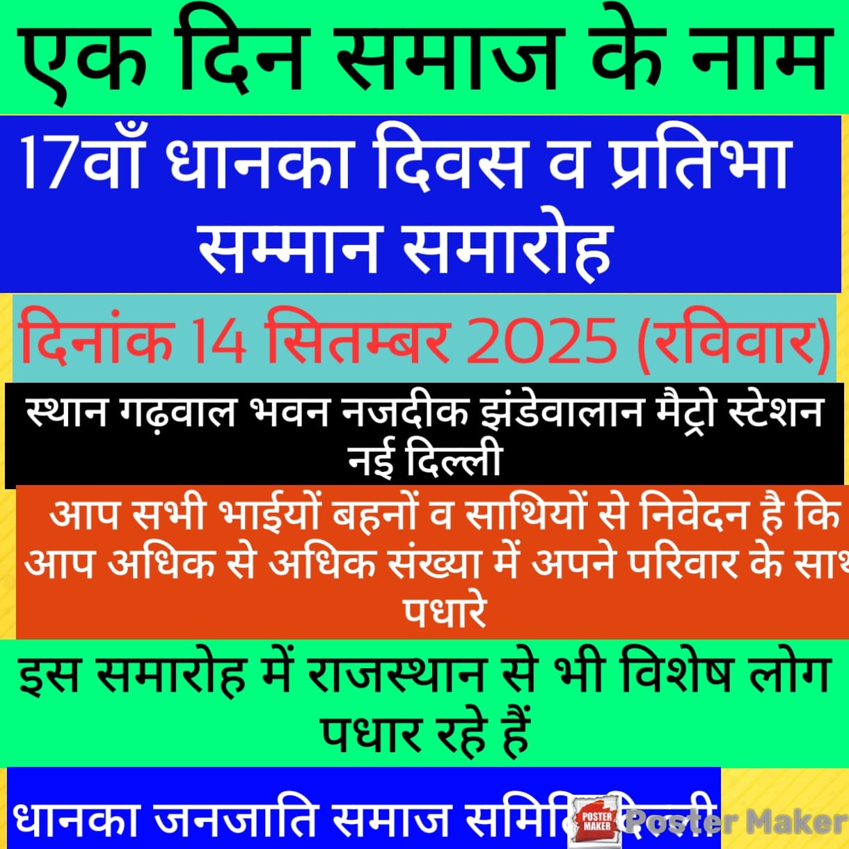 आपकी धानका जनजाति समाज समिति ने वर्ष 2018 , 12वाॉं धानका दिवस एवम प्रतिभा सम्मान समारोह में स्व. श्री डाल चन्द जी आर्या को मरण उपरांत आज ही के दिन धानका रत्न से सम्मानित किया गया था!